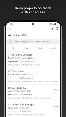 Keep projects on track with a centralized schedule. View the schedule by different timespans or filter by critical items, review dependencies, and assess schedule suggestions.