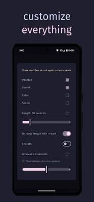 • Multi-dimensional challenge: Train your brain with up to four stimuli, including position, sound, color, and shape, so you can push your working memory and fluid intelligence to levels beyond the traditional n-back task.